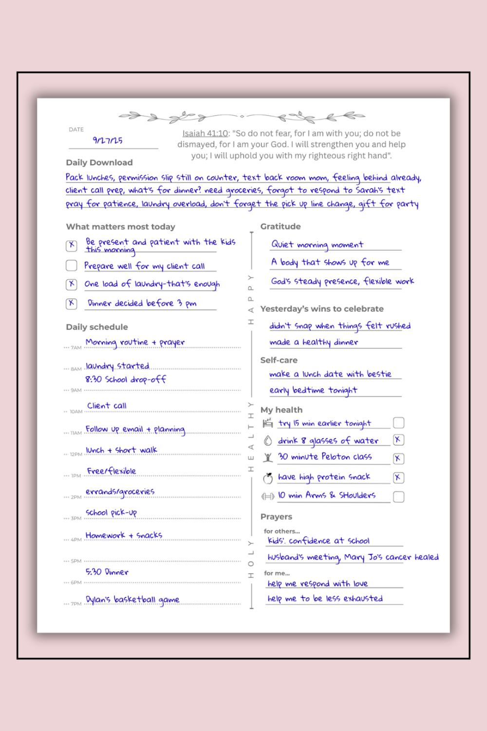 I love planners - always have. But through years of coaching moms, I've seen how much we need a place to clear the mental swirl before we can think straight about our day. This planner is organized around everything that actually creates peace: space for your thoughts, your faith, your real priorities. It's all my favorite things in one place - the stuff that makes days feel happy, healthy, and holy instead of just busy. I created this planner for women who feel like they're carrying too much - mentally, emotionally, and spiritually. Take a look in the video below!