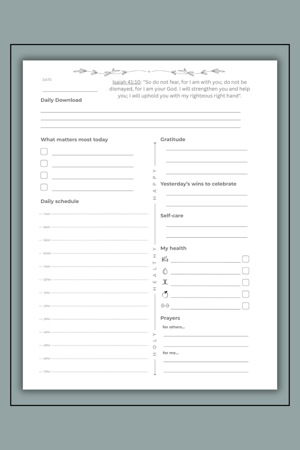 This planner is designed for real life. Some days you'll fill every section. Some days you'll write one line. Both are enough. It isn't a pre-dated planner, so you can come back to it whenever you need to get organized or want to be more intentional. It's different because it focuses on the true things that will bring purpose to your days.